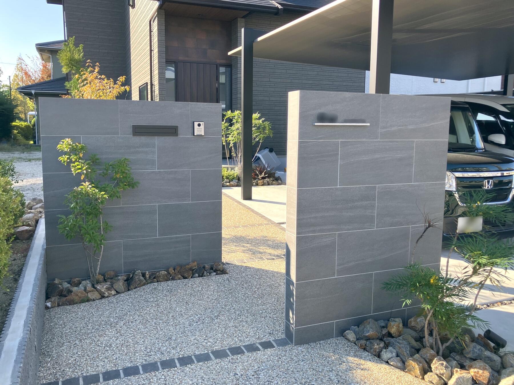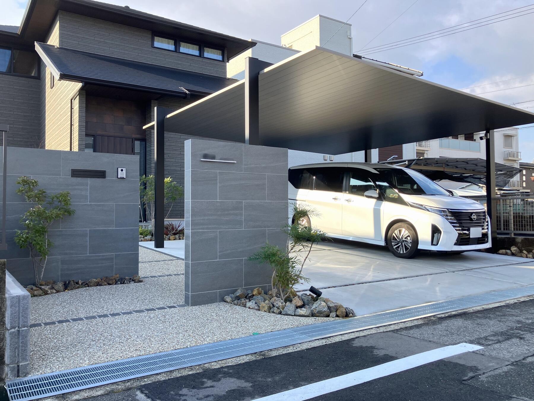 LIXIL カーポートSCワイド・タイル門袖のオープン外構