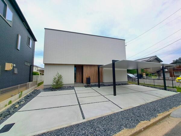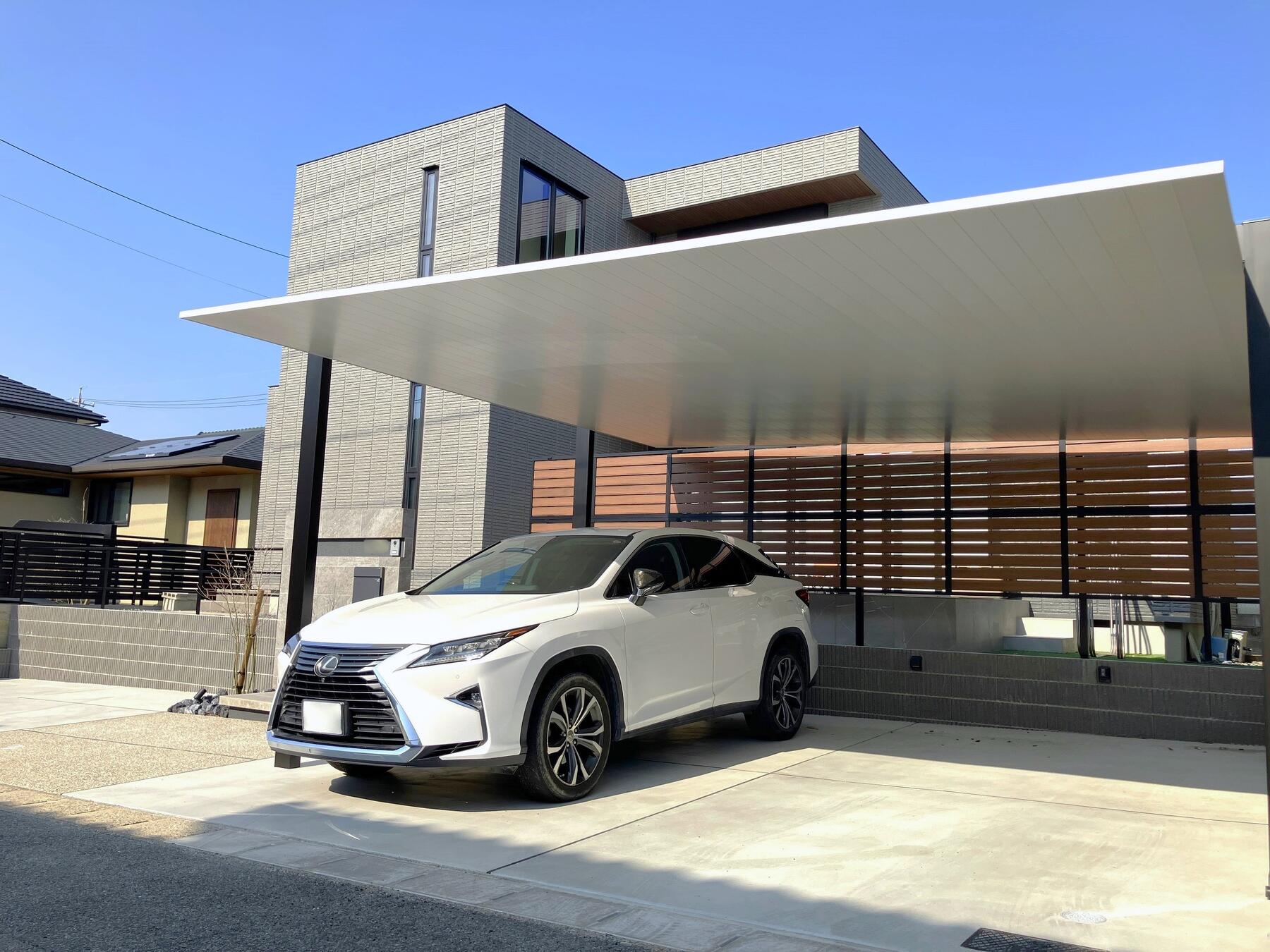カーポートだけでなく、門柱や植栽にもこだわったデザインでお住いの印象を引き立てる