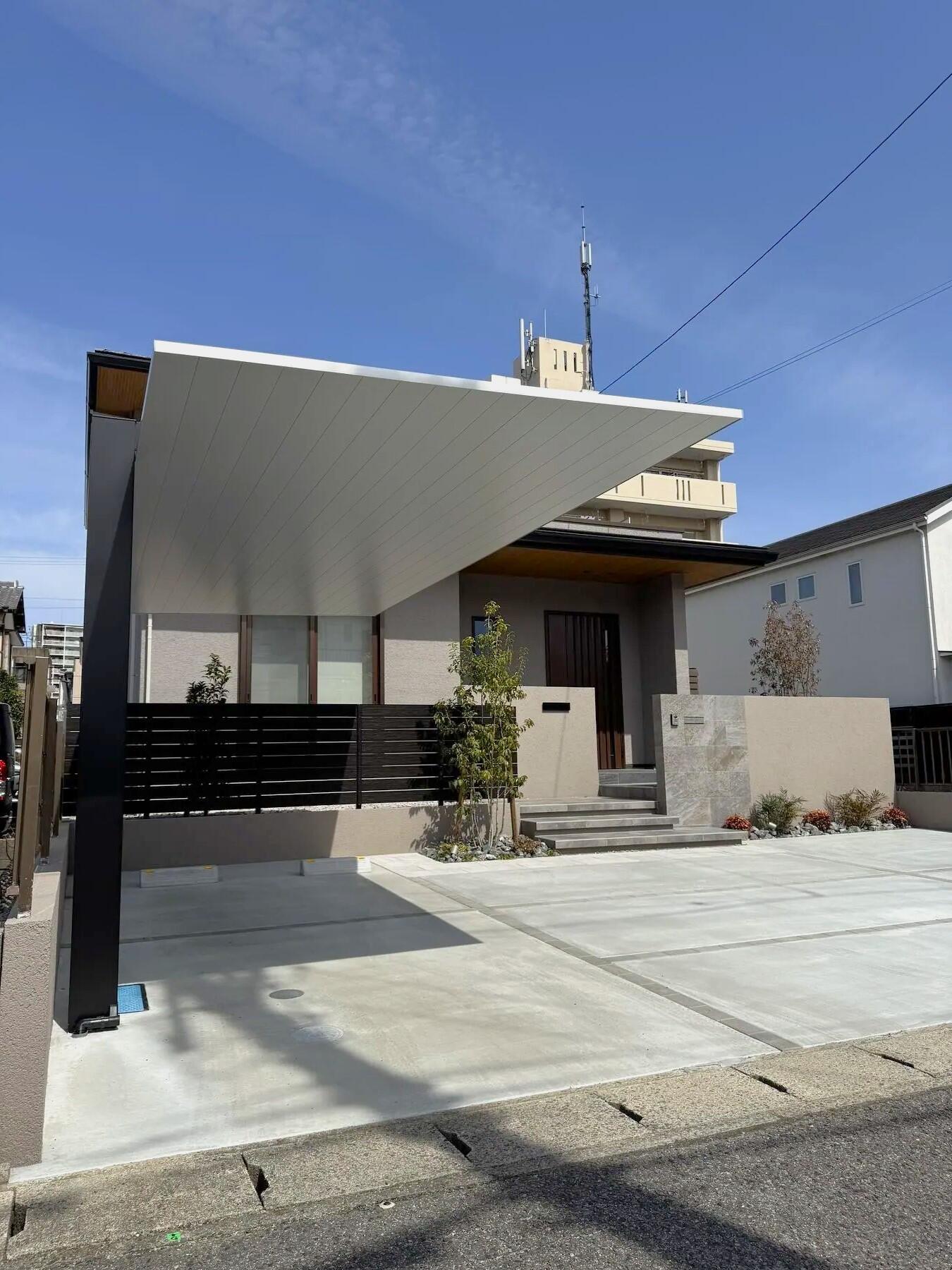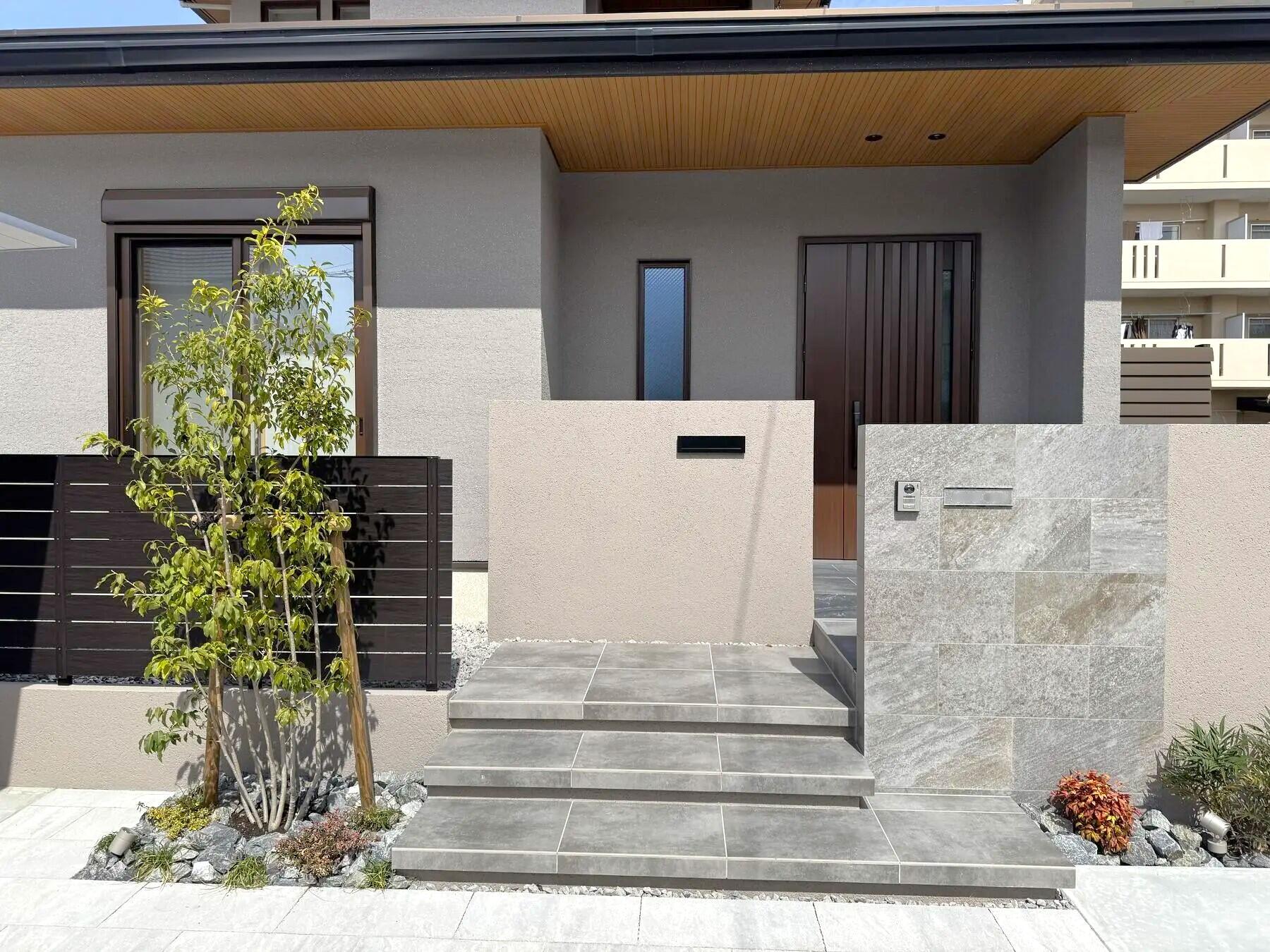 全体のイメージは、カーポートSCと木調のフェンス、石調、塗りの門塀といったいろいろな表情のある材料をつかいながらも、まとありのある落ち着いた雰囲気になるようにこころがけました。
