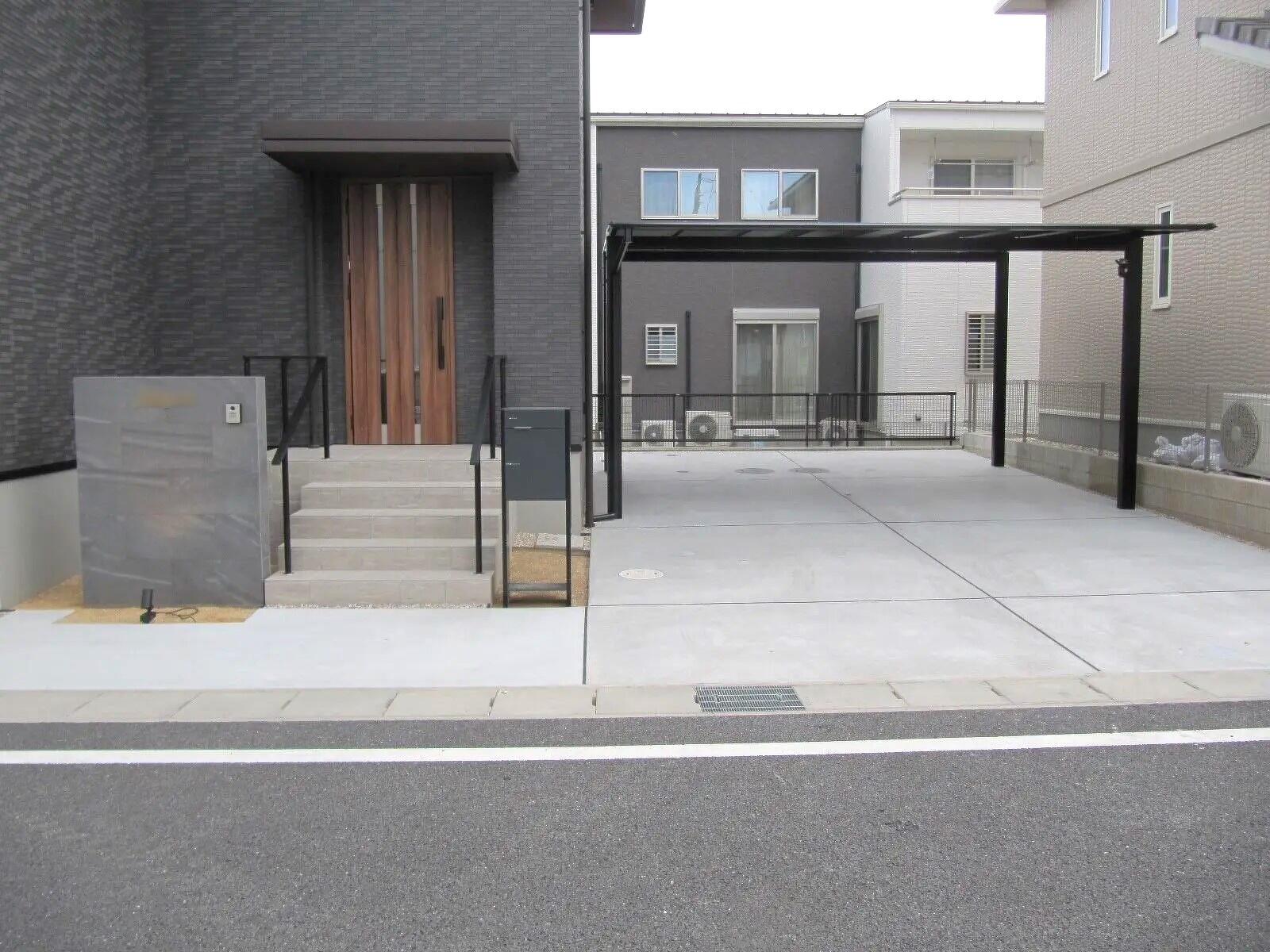 カーポート・フェンス・宅配ボックスをブラック色で統一しカーポートの屋根材もブラックポリカを使い一体感を待たせました。