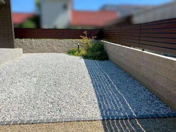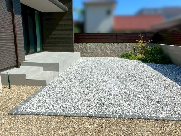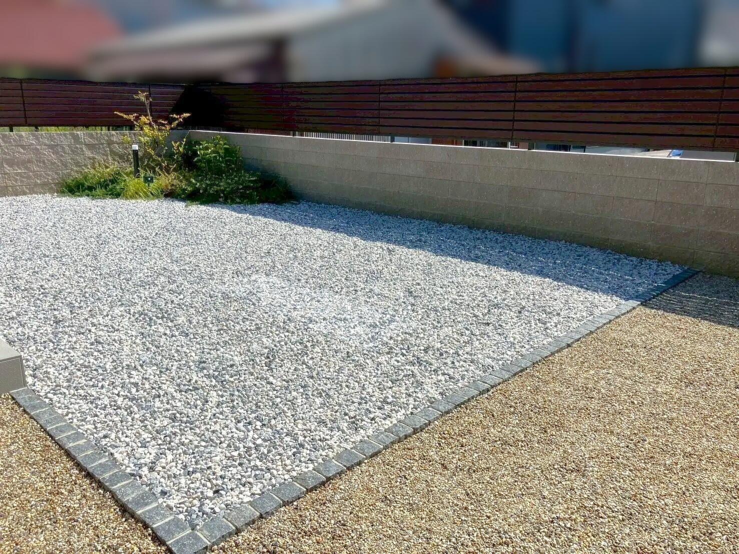 天然芝の手入れが大変になってきたので、タイルデッキやピンコロと違和感のない砂利を敷きたい。