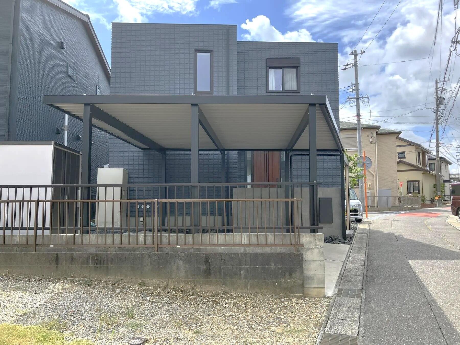 駐車場が変形しているが無駄なく屋根で覆いたい。既存の門袖などにもマッチさせたい。