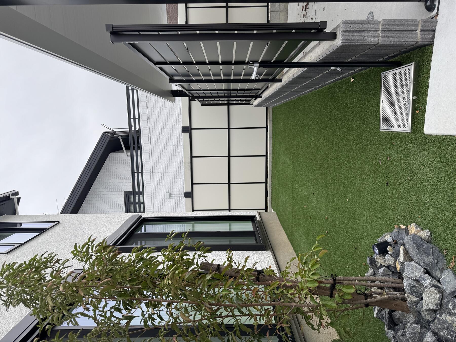 庭は人工芝にすることでほぼ手入れは不要です。シンプルなレイアウトの中のアクセントという役割で、門廻り、玄関廻りに植栽を提案しました
