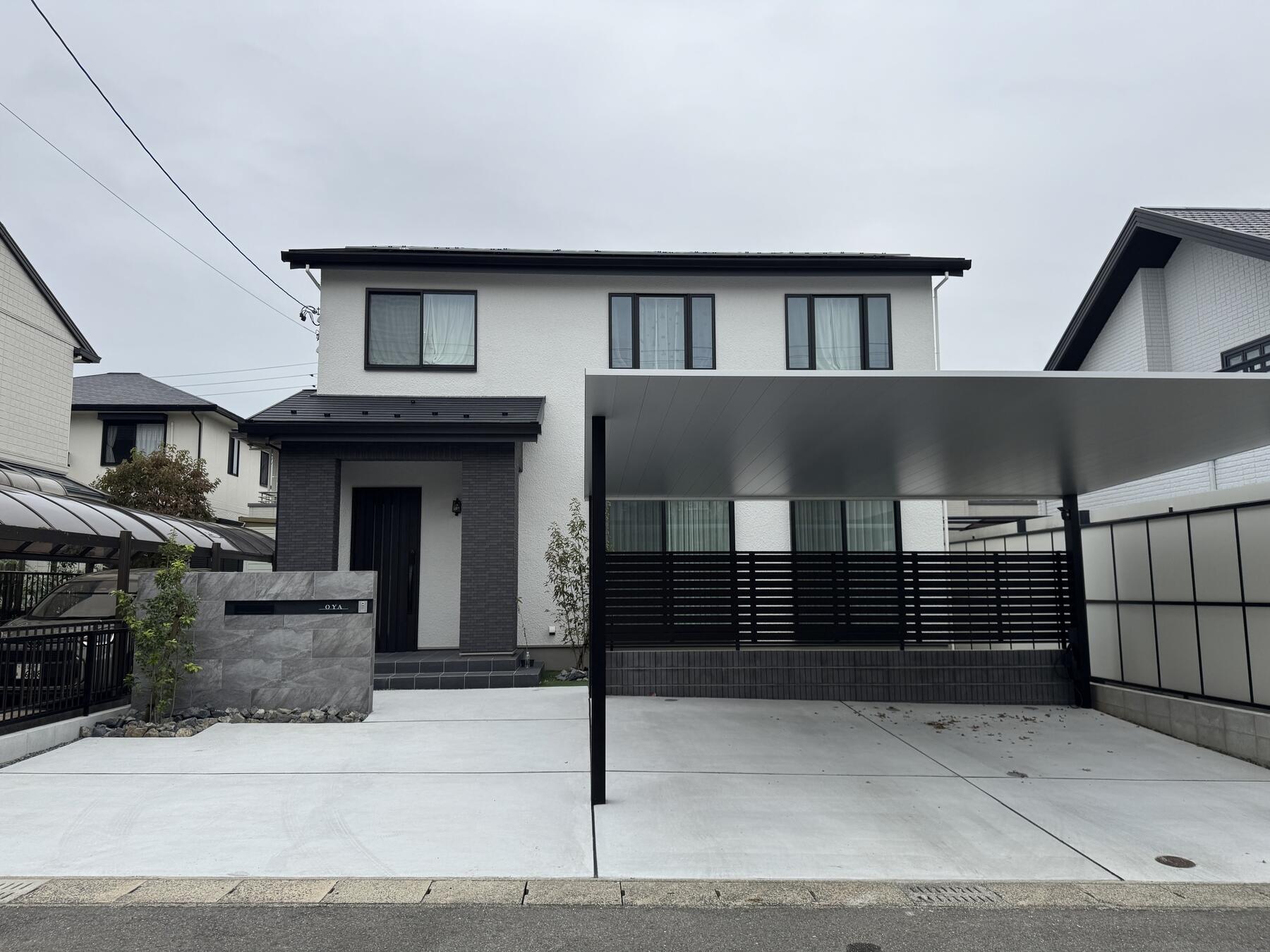 カーポートは後柱が一番後ろにあるため、乗り降りのしやすいプレーンルーフを提案しました。駐車場は広いので、普段使いがしやすいように幅6mのサイズです。