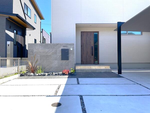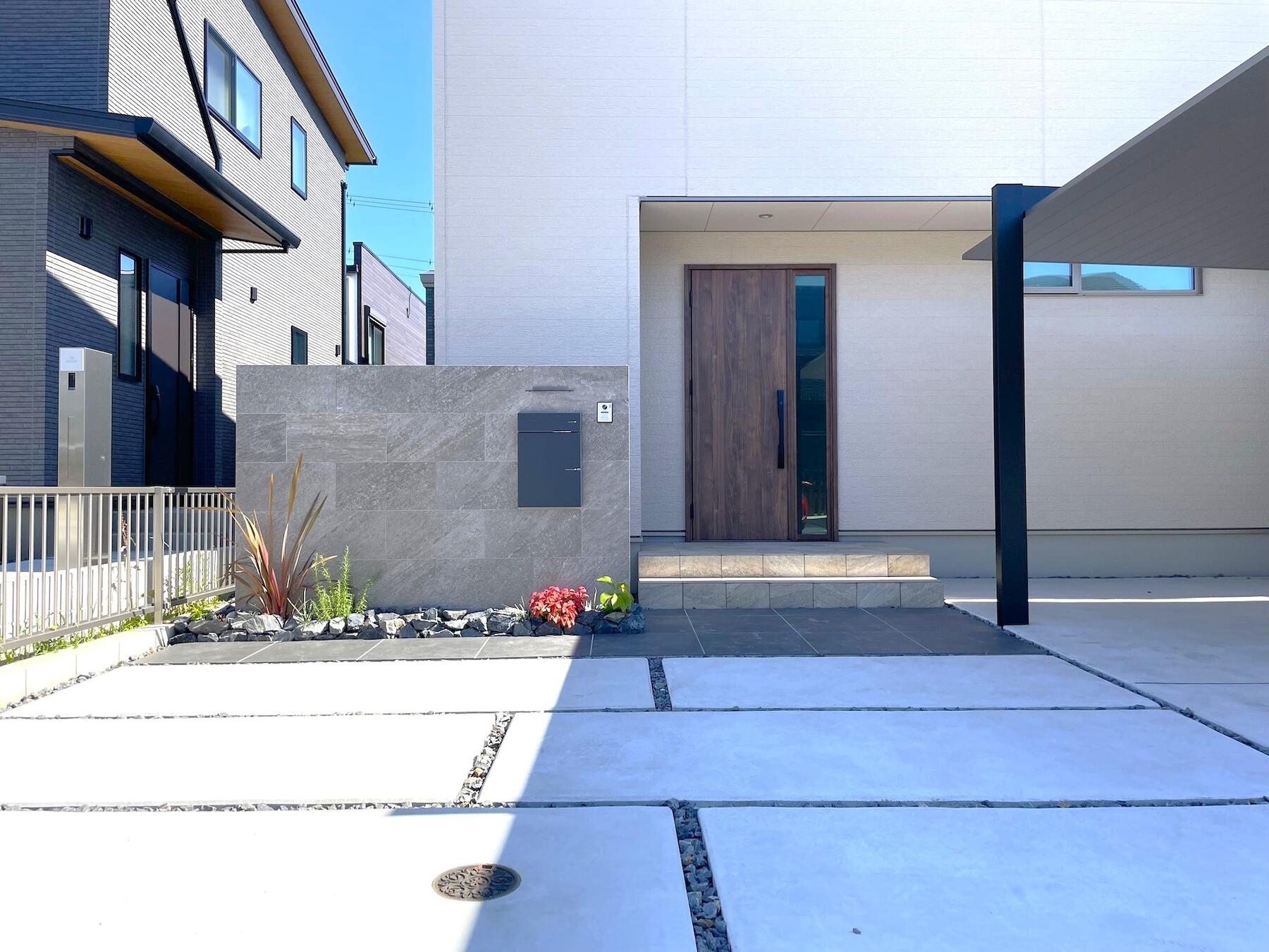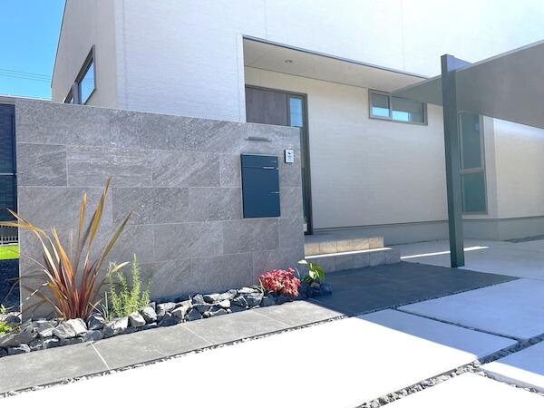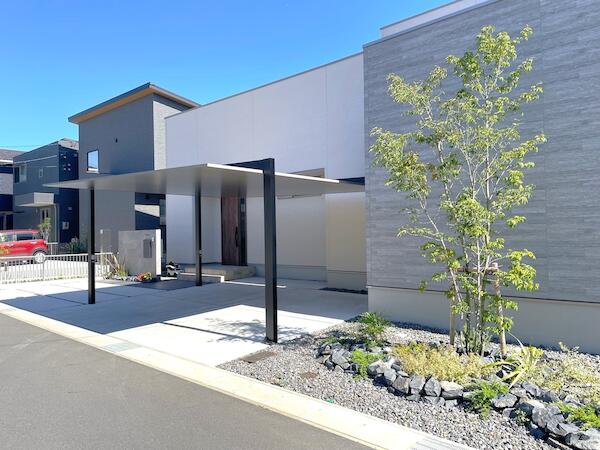 シンプルモダンな建物の外観も際立たせるよう石目調のタイル素材とスタイリッシュなデザインのカーポートSCを組み合わせることで洗練された高級感を演出しました。