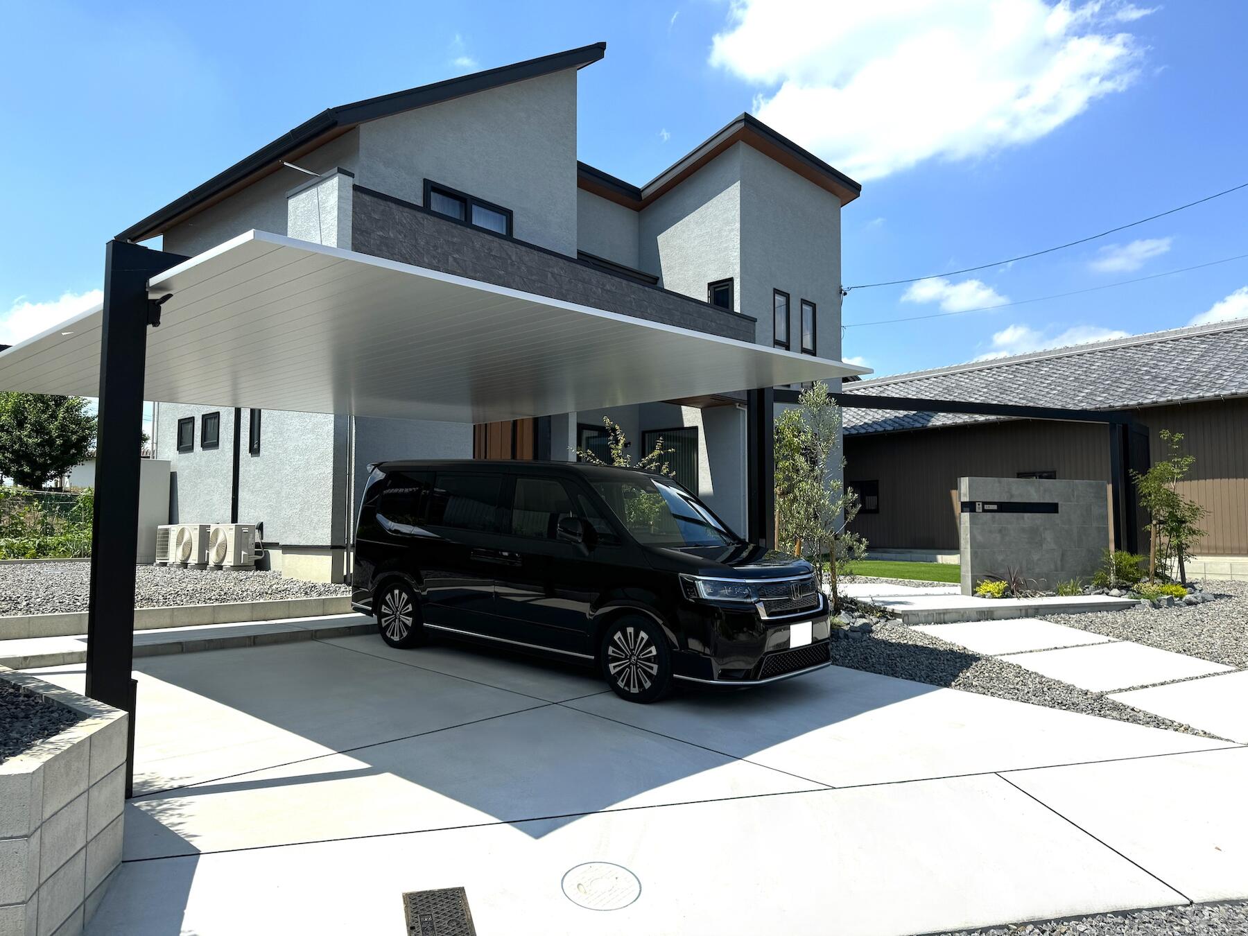 駐車スペースのカーポートSCはシャープな住宅の外観を損なうことなく見事に調和しています。
